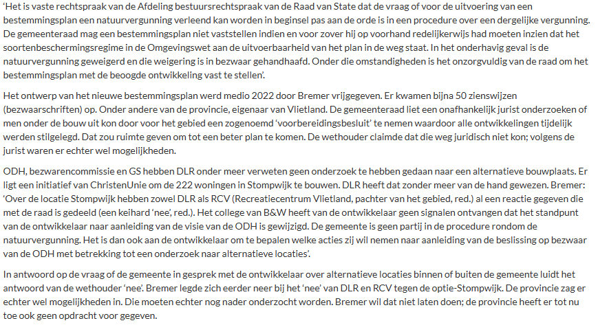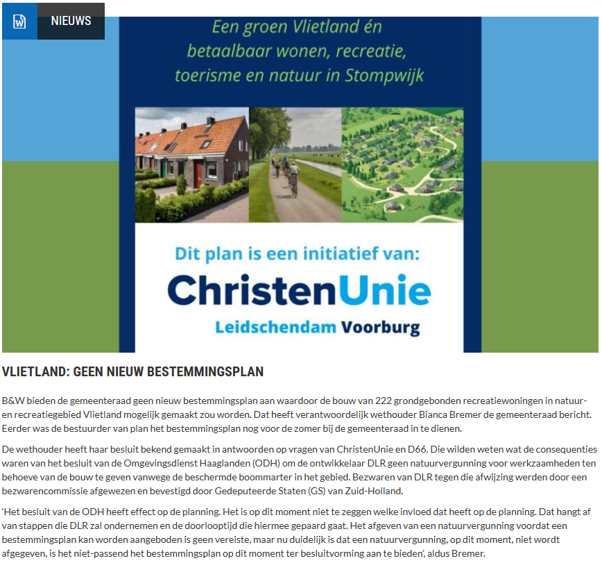 B&W bieden de gemeenteraad geen nieuw bestemmingsplan aan waardoor de bouw van 222 grondgebonden recreatiewoningen in natuur- en recreatiegebied Vlietland mogelijk gemaakt zou worden. Dat heeft verantwoordelijk wethouder Bianca Bremer de gemeenteraad bericht. Eerder was de bestuurder van plan het bestemmingsplan nog voor de zomer bij de gemeenteraad in te dienen.