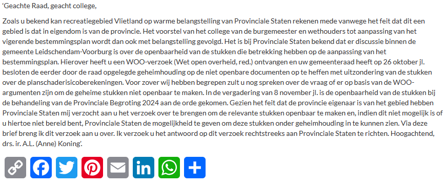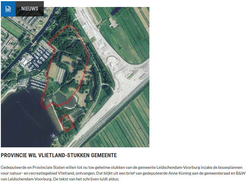 Gedeputeerde en Provinciale Staten willen tot nu toe geheime stukken van de gemeente Leidschendam-Voorburg inzake de bouwplannen voor natuur- en recreatiegebied Vlietland, ontvangen. Dat blijkt uit een brief van gedeputeerde Anne Koning aan de gemeenteraad en B&W van Leidschendam-Voorburg. De tekst van het schrijven lees je in het item hieronder.