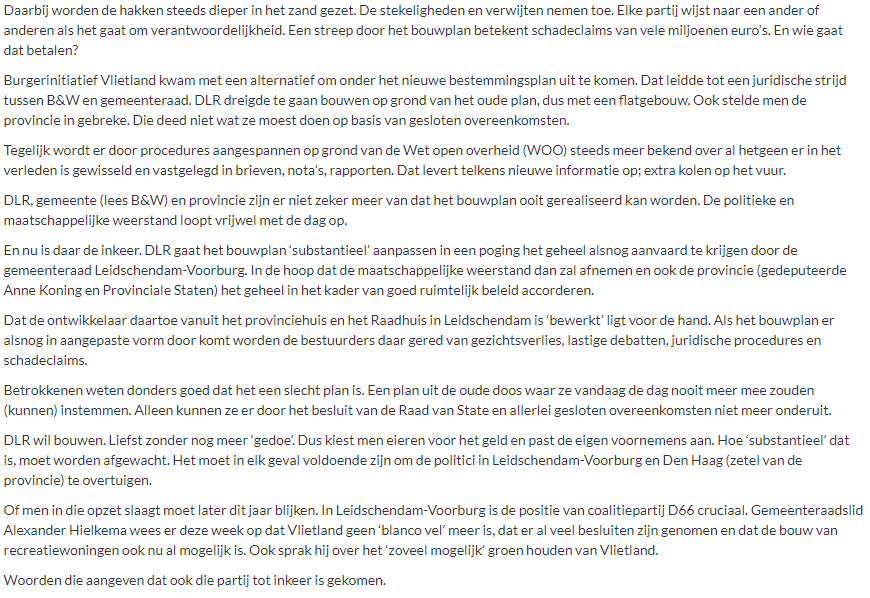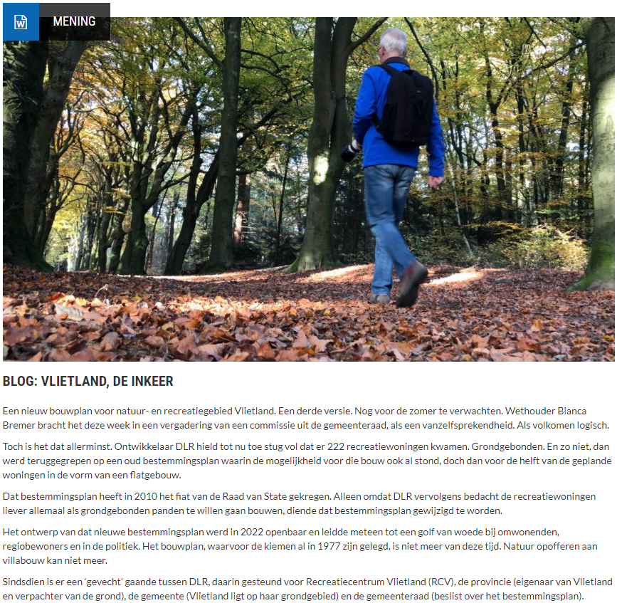 Een nieuw bouwplan voor natuur- en recreatiegebied Vlietland. Een derde versie. Nog voor de zomer te verwachten. Wethouder Bianca Bremer bracht het deze week in een vergadering van een commissie uit de gemeenteraad, als een vanzelfsprekendheid. Als volkomen logisch.