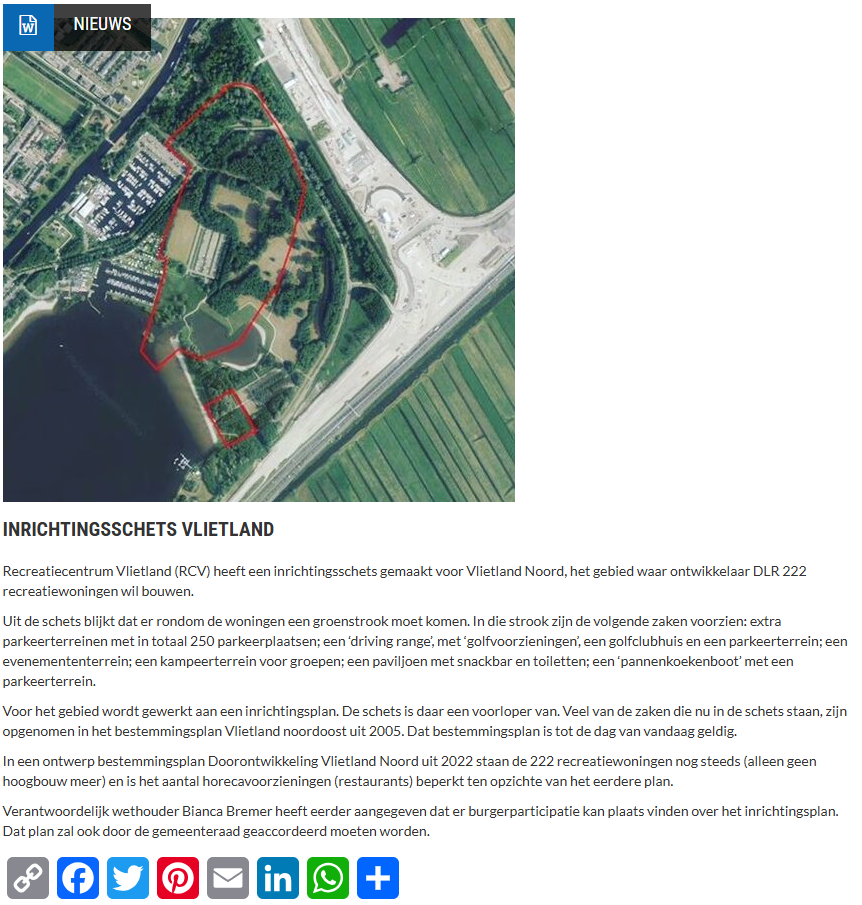 Recreatiecentrum Vlietland (RCV) heeft een inrichtingsschets gemaakt voor Vlietland Noord, het gebied waar ontwikkelaar DLR 222 recreatiewoningen wil bouwen.