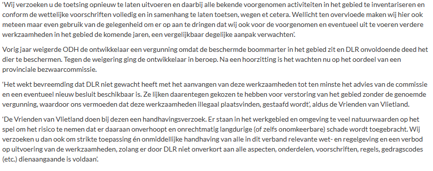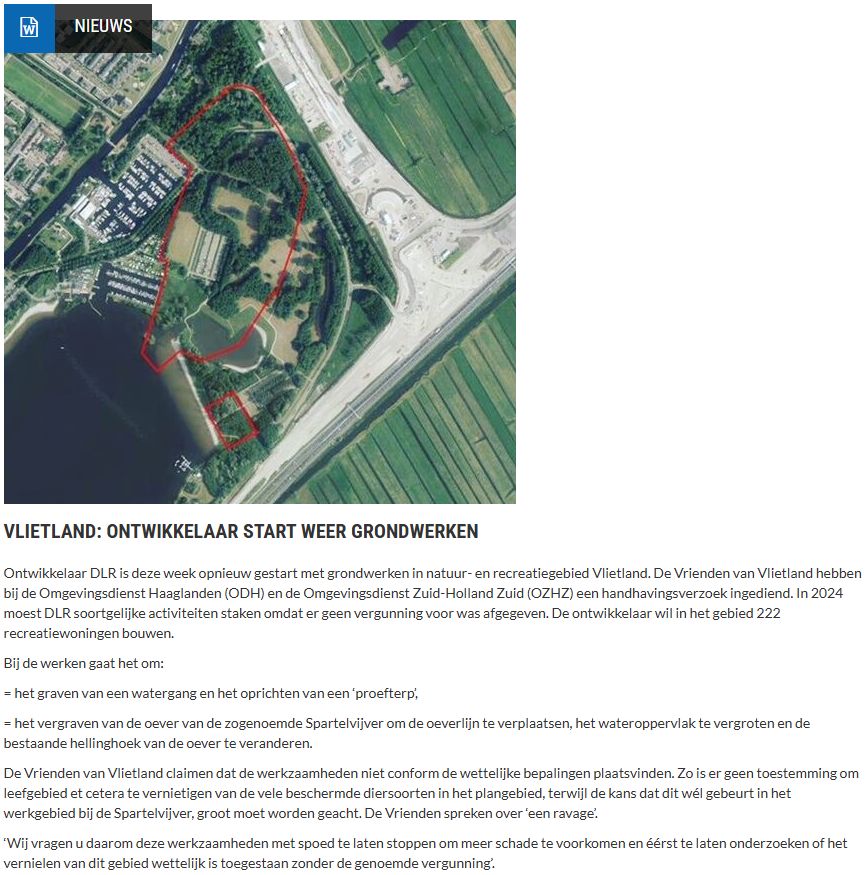 Ontwikkelaar DLR is deze week opnieuw gestart met grondwerken in natuur- en recreatiegebied Vlietland. De Vrienden van Vlietland hebben bij de Omgevingsdienst Haaglanden (ODH) en de Omgevingsdienst Zuid-Holland Zuid (OZHZ) een handhavingsverzoek ingediend. In 2024 moest DLR soortgelijke activiteiten staken omdat er geen vergunning voor was afgegeven. De ontwikkelaar wil in het gebied 222 recreatiewoningen bouwen.