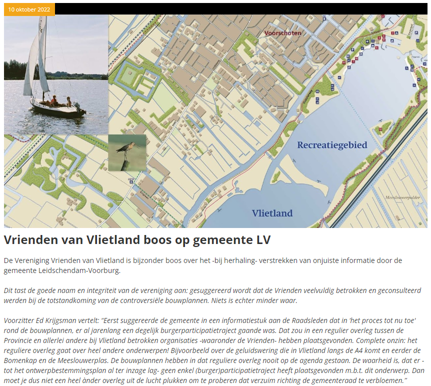 Nieuwsbericht 10 oktober 2022 op Midvliet over Vrienden van Vlietland boos op gemeente LV