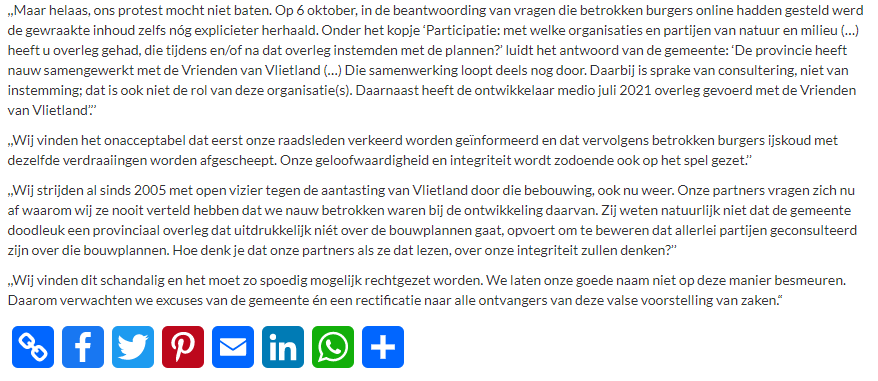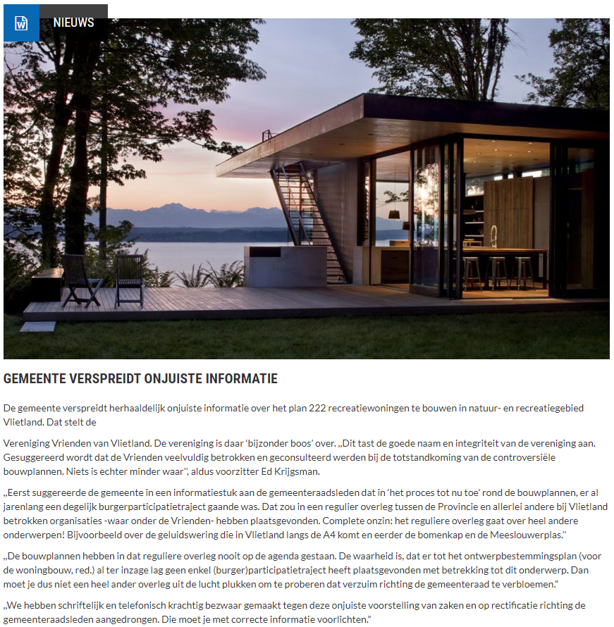 Naar aanleiding van het persbericht van de Vereniging Vrienden van Vlietland over het verstrekken van onjuiste informatie door de gemeente Leidschendam-Voorburg is dit uitgebreid door de media overgenomen.