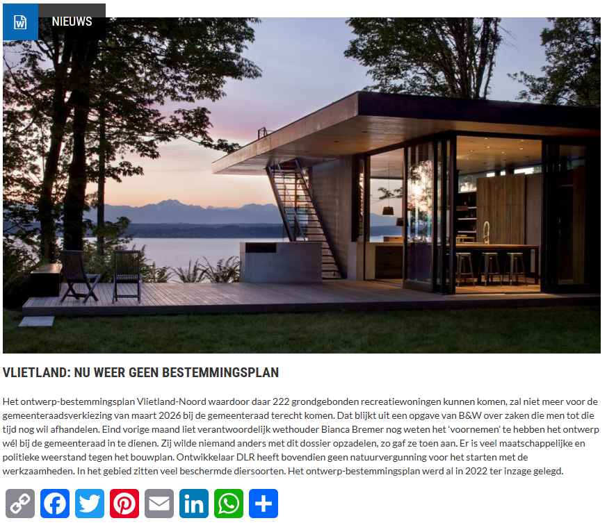 Het ontwerpbestemmingsplan Vlietland-Noord waardoor daar 222 grondgebonden recreatiewoningen kunnen komen, zal niet meer voor de gemeenteraadsverkiezing van maart 2026 bij de gemeenteraad terecht komen.