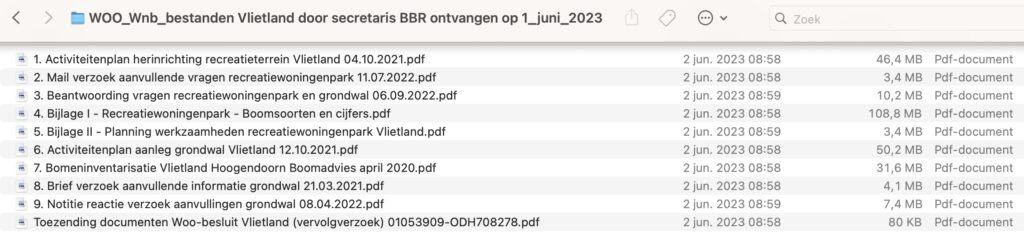 Op grond van de Wet open overheid (Woo) heeft de Bomenbond Rijnland op 1 juni 2023 opgevraagde documenten ontvangen aangaande de ontheffingsverzoeken Wet natuurbescherming (Wnb), die projectontwikkelaar Dutch Lake Residence (DLR) bij de Omgevingsdienst Haaglanden in 2021 en 2022 had ingediend – en in mei 2023 weer ingetrokken – voor het bouwen van 222 vakantievilla’s, het aanleggen van 569 parkeerplaatsen en een 900 meter lange, 60 meter brede, 12 meter hoge grondwal in Vlietland (qua specifieke locatie bekend als Vlietland Noord).