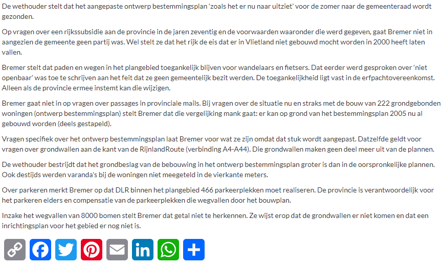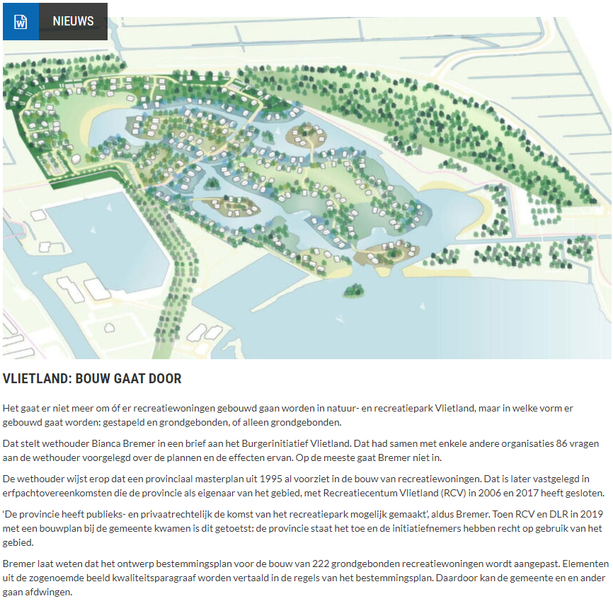 Het gaat er niet meer om óf er recreatiewoningen gebouwd gaan worden in natuur- en recreatiepark Vlietland, maar in welke vorm er gebouwd gaat worden: gestapeld en grondgebonden, of alleen grondgebonden. Dat stelt wethouder Bianca Bremer in een brief aan het Burgerinitiatief Vlietland. Dat had samen met enkele andere organisaties 86 vragen aan de wethouder voorgelegd over de plannen en de effecten ervan. Op de meeste gaat Bremer niet in zoals je kan lezen in het item hieronder.