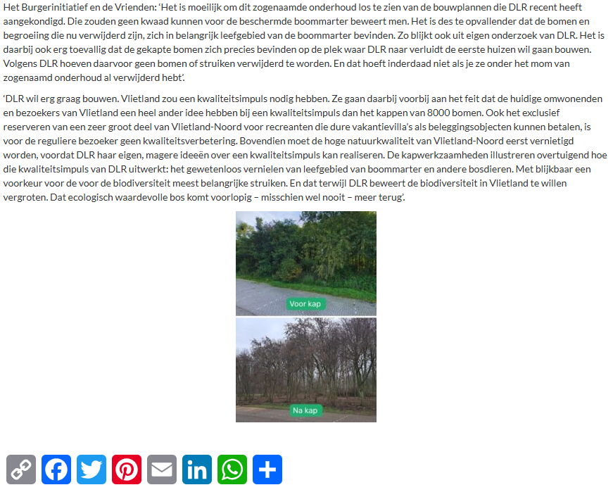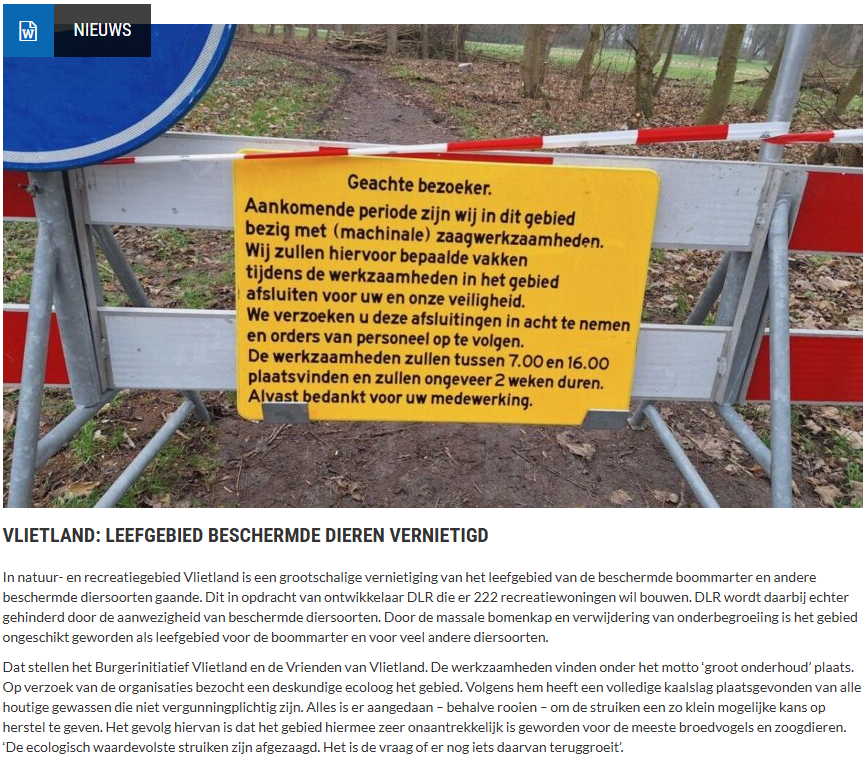 In natuur- en recreatiegebied Vlietland is een grootschalige vernietiging van het leefgebied van de beschermde boommarter en andere beschermde diersoorten gaande. Dit in opdracht van ontwikkelaar DLR die er 222 recreatiewoningen wil bouwen. DLR wordt daarbij echter gehinderd door de aanwezigheid van beschermde diersoorten. Door de massale bomenkap en verwijdering van onderbegroeiing is het gebied ongeschikt geworden als leefgebied voor de boommarter en voor veel andere diersoorten.