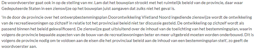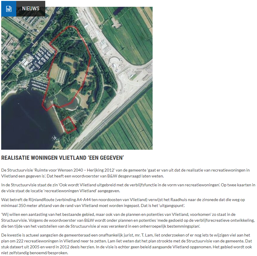 De Structuurvisie ‘Ruimte voor Wensen 2040 – Herijking 2012’ van de gemeente ‘gaat er van uit dat de realisatie van recreatiewoningen in Vlietland een gegeven is’. Dat heeft een woordvoerster van B&W desgevraagd laten weten.