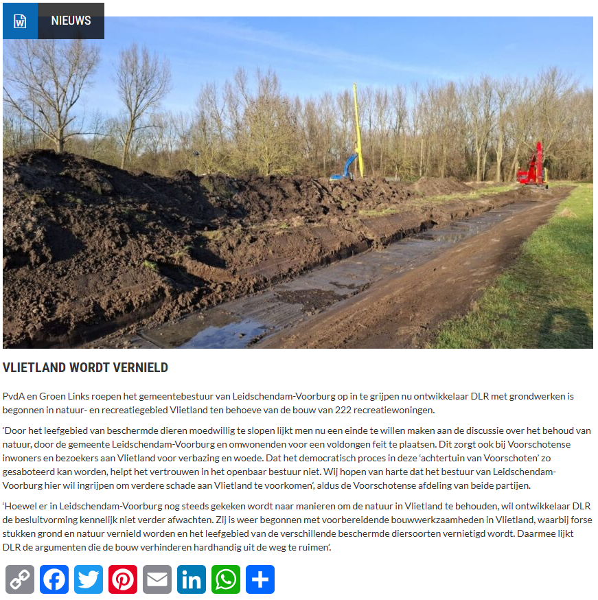 PvdA en Groen Links roepen het gemeentebestuur van Leidschendam-Voorburg op in te grijpen nu ontwikkelaar DLR met grondwerken is begonnen in natuur- en recreatiegebied Vlietland ten behoeve van de bouw van 222 recreatiewoningen.