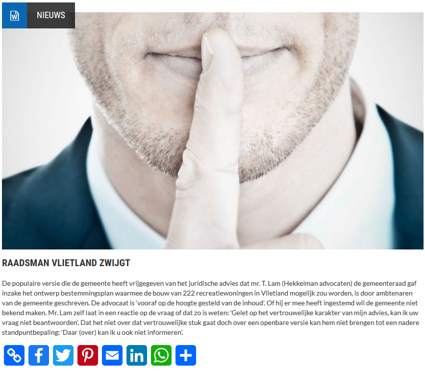 Nieuwsbericht 17 juli 2023 op Vlietnieuws over Raadsman Vlietland zwijgt