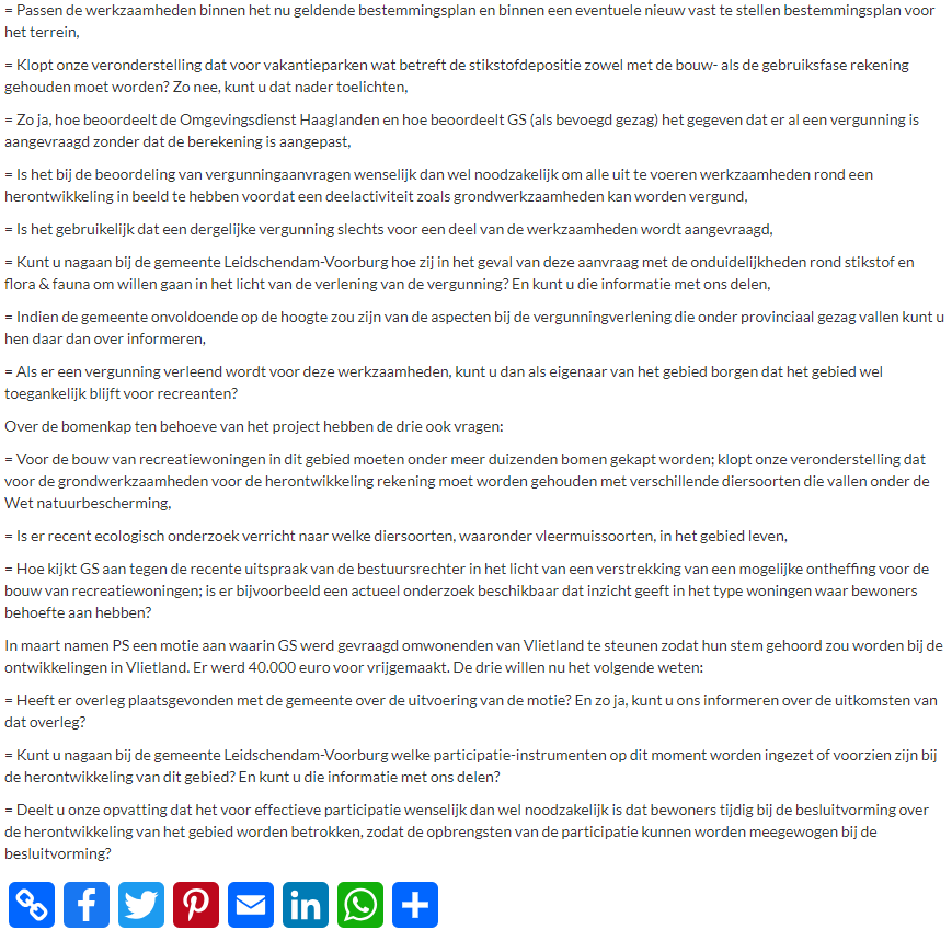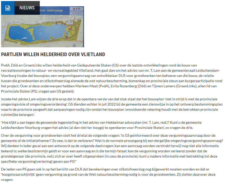 PvdA, D66 en GroenLinks willen helderheid van Gedeputeerde Staten (GS) over de laatste ontwikkelingen rond de bouw van recreatiewoningen in natuur- en recreatiegebied Vlietland. Het gaat dan om het advies van mr. T. Lam aan de gemeenteraad Leidschendam-Voorburg inzake dat bouwplan, een vergunningaanvraag van ontwikkelaar DLR voor grondwerken ten behoeve van die bouw, de relatie tussen die grondwerken en stikstofneerslag alsmede de wet natuurbescherming, bomenkap en provinciale steun aan burgerparticipatie rond het project. Over al deze onderwerpen hebben Marleen Maat (PvdA), Evita Rozenberg (D66) en Tijmen Lamers (GroenLinks), allen lid van Provinciale Staten (PS), vragen aan GS gesteld.