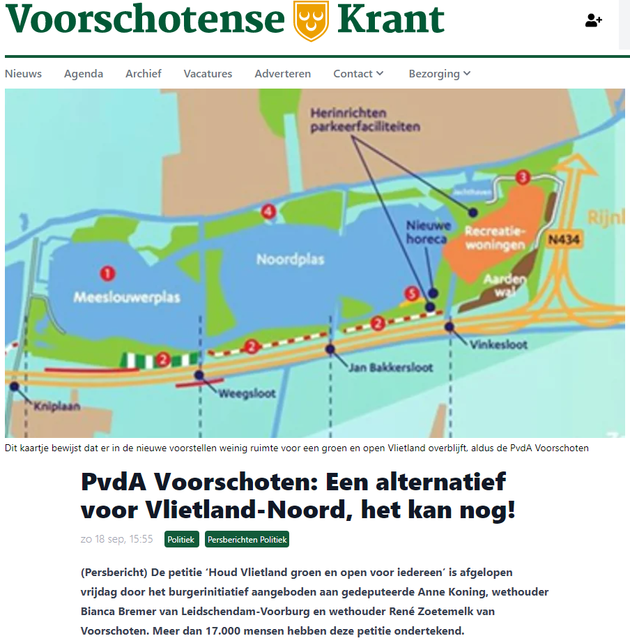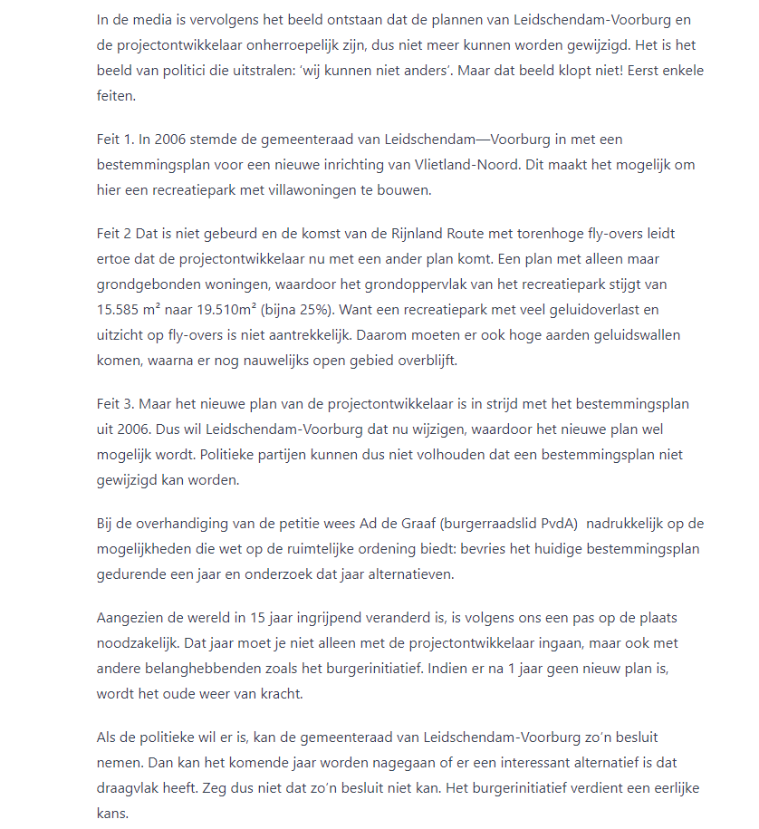 PvdA Voorschoten heeft in haar persbericht opgeroepen de feiten te accepteren. In de media is het beeld ontstaan dat de plannen van Leidschendam-Voorburg en de projectontwikkelaar onherroepelijk zijn, dus niet meer kunnen worden gewijzigd. Het is het beeld van politici die uitstralen: ‘wij kunnen niet anders’. Maar dat beeld klopt niet!