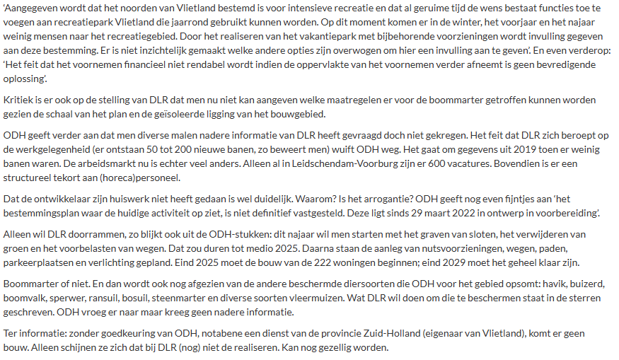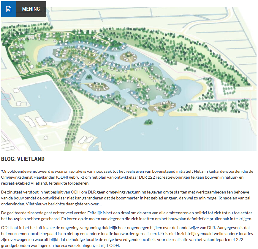 ‘Onvoldoende gemotiveerd is waarom sprake is van noodzaak tot het realiseren van bovenstaand initiatief’. Het zijn keiharde woorden die de Omgevingsdienst Haaglanden (ODH) gebruikt om het plan van ontwikkelaar DLR 222 recreatiewoningen te gaan bouwen in natuur- en recreatiegebied Vlietland, feitelijk te torpederen.