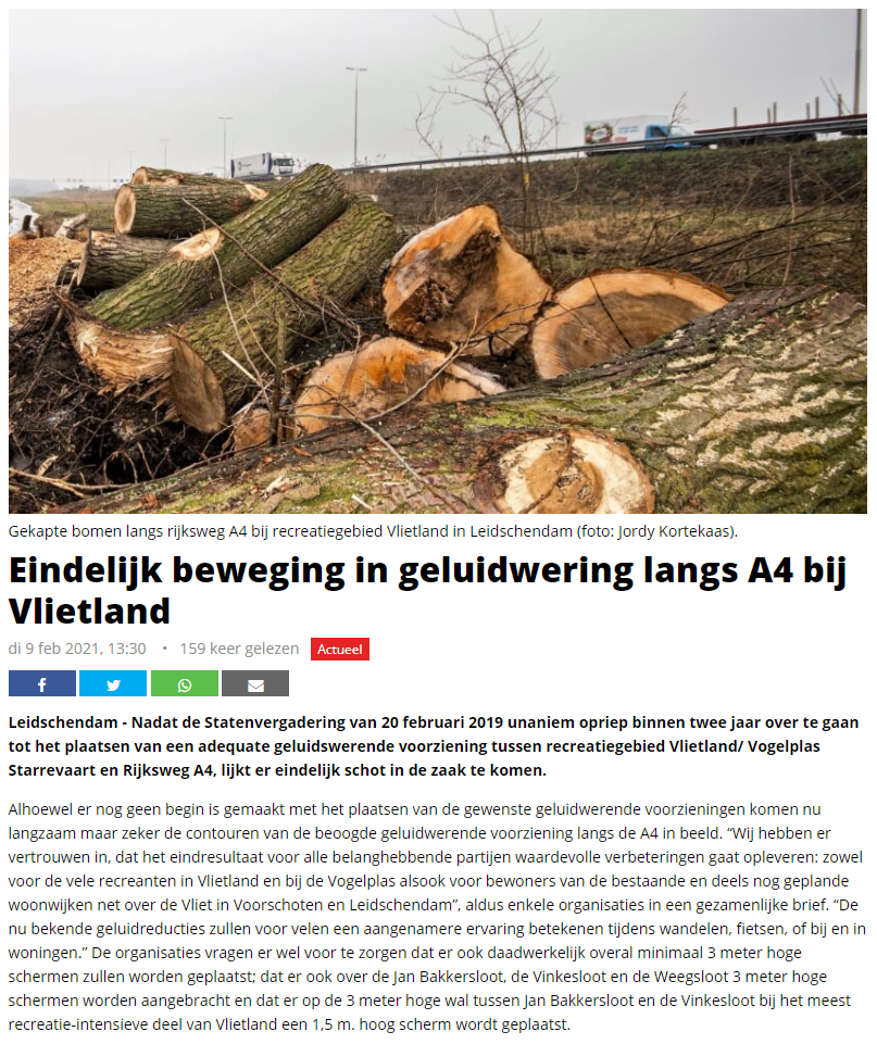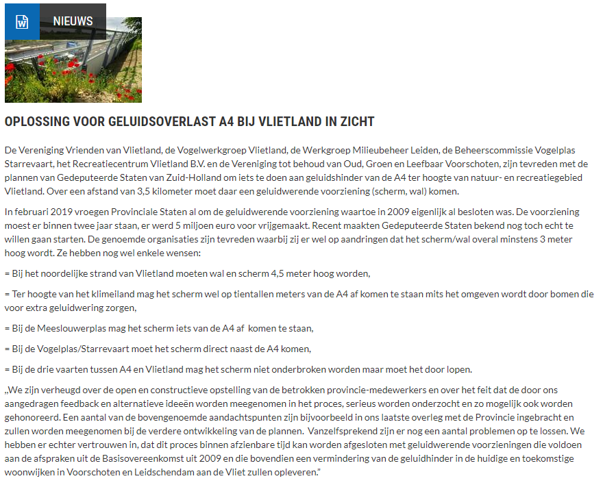 De gebiedspartijen hebben een reactie op het Statenvoorstel van 15 december jl. “Motie 867 Geluidbeperkende maatregelen Vlietland” aan Provinciale Staten (PS) gezonden. Wij laten weten tevreden te zijn over de recente gang van zaken en samenwerking met de provincie en doen verder een aantal verzoeken om zo langs Vlietland en de Vogelplas Starrevaart werkelijk tot de gewenste geluidwering te komen. Daarbij houden wij rekening met het budget dat PS voor de geluidwering ter beschikking heeft gesteld.