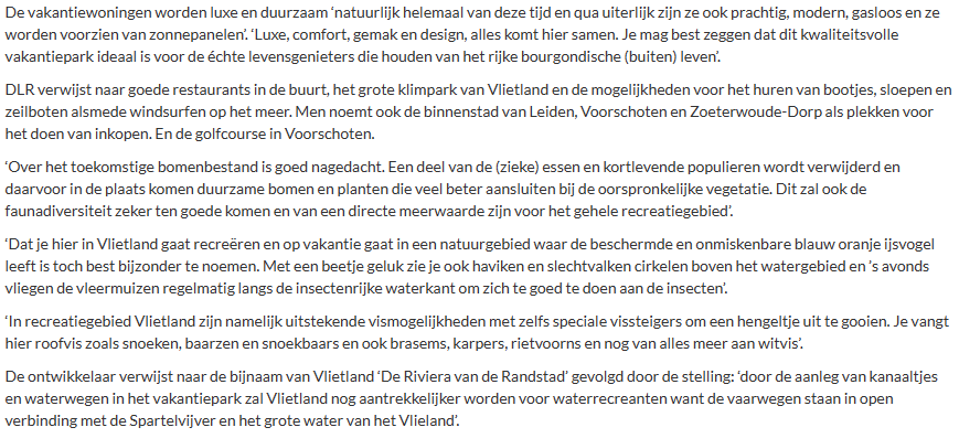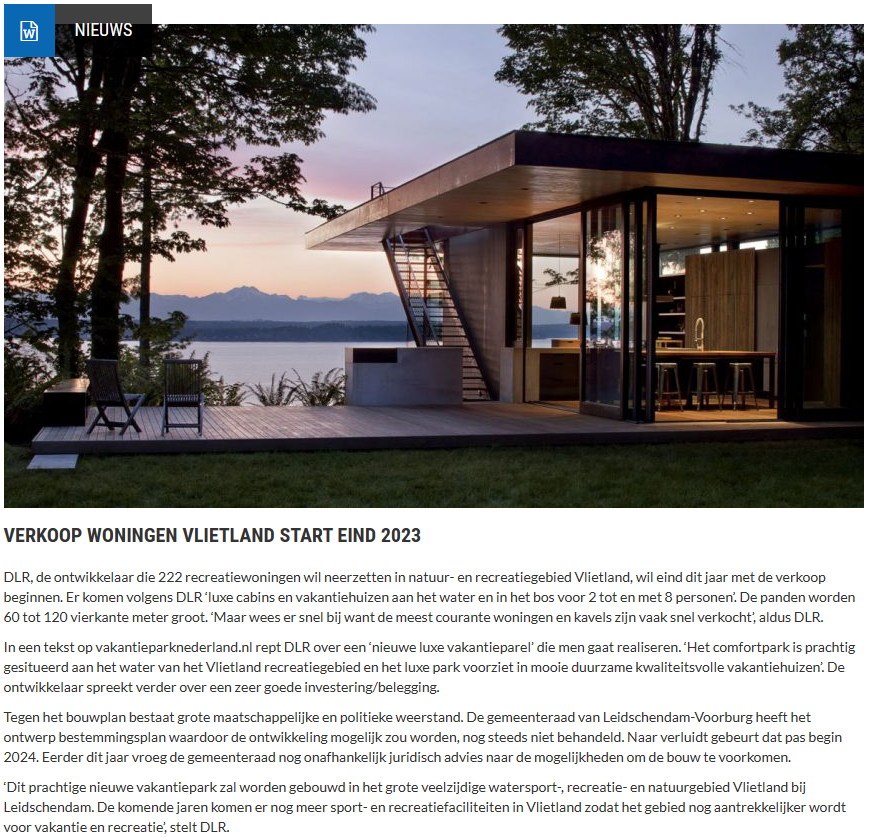 DLR, de ontwikkelaar die 222 recreatiewoningen wil neerzetten in natuur- en recreatiegebied Vlietland, wil eind dit jaar met de verkoop beginnen. Er komen volgens DLR ‘luxe cabins en vakantiehuizen aan het water en in het bos voor 2 tot en met 8 personen’. De panden worden 60 tot 120 vierkante meter groot. ‘Maar wees er snel bij want de meest courante woningen en kavels zijn vaak snel verkocht’, aldus DLR. De Vrienden denken dat DLR veel te hard van stapel loopt!