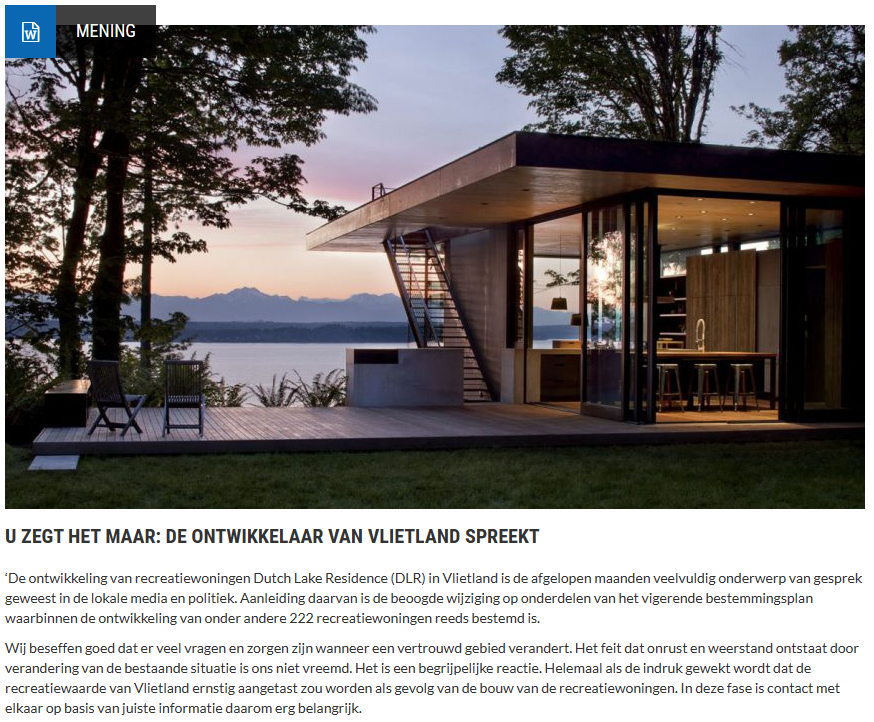 De ontwikkeling van recreatiewoningen Dutch Lake Residence (DLR) in Vlietland is de afgelopen maanden veelvuldig onderwerp van gesprek geweest in de lokale media en politiek. Aanleiding daarvan is de beoogde wijziging op onderdelen van het vigerende bestemmingsplan waarbinnen de ontwikkeling van onder andere 222 recreatiewoningen reeds bestemd is.