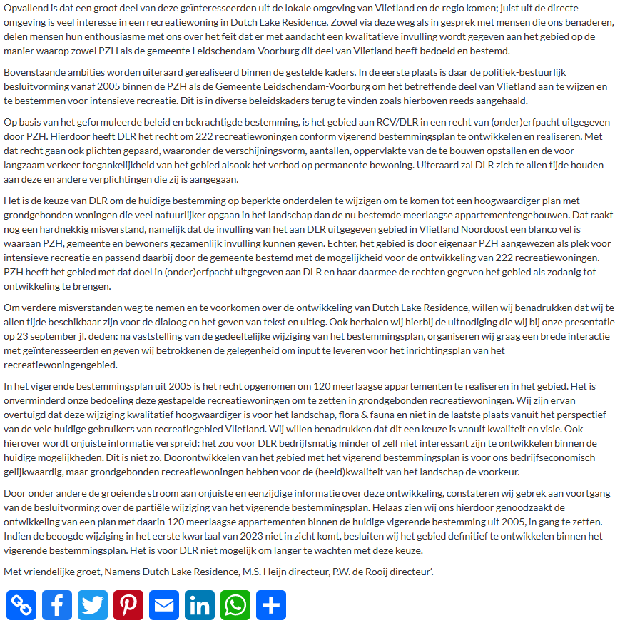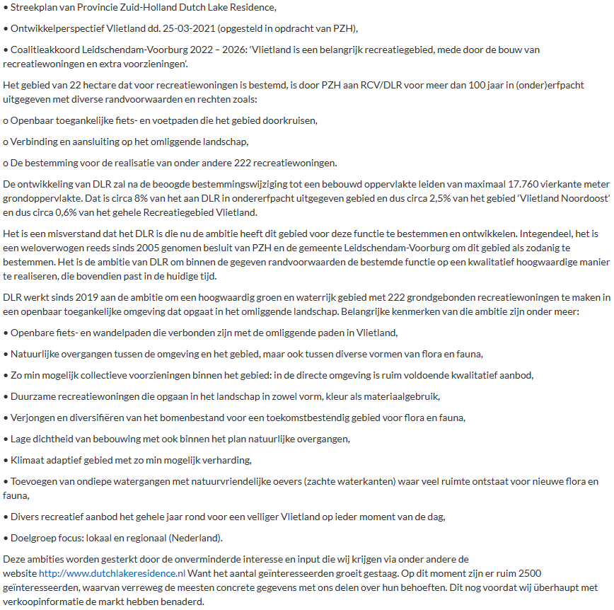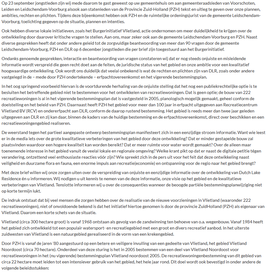 Dit is de eerste alinea van een brief die namens Dutch Lake Residence aan de Gemeenteraad van Leidschendam-Voorburg is gezonden. Hieronder lees je de volledige brief zoals deze op Vlietnieuws is verschenen. De reactie van de Vrienden van Vlietland lees je hier.