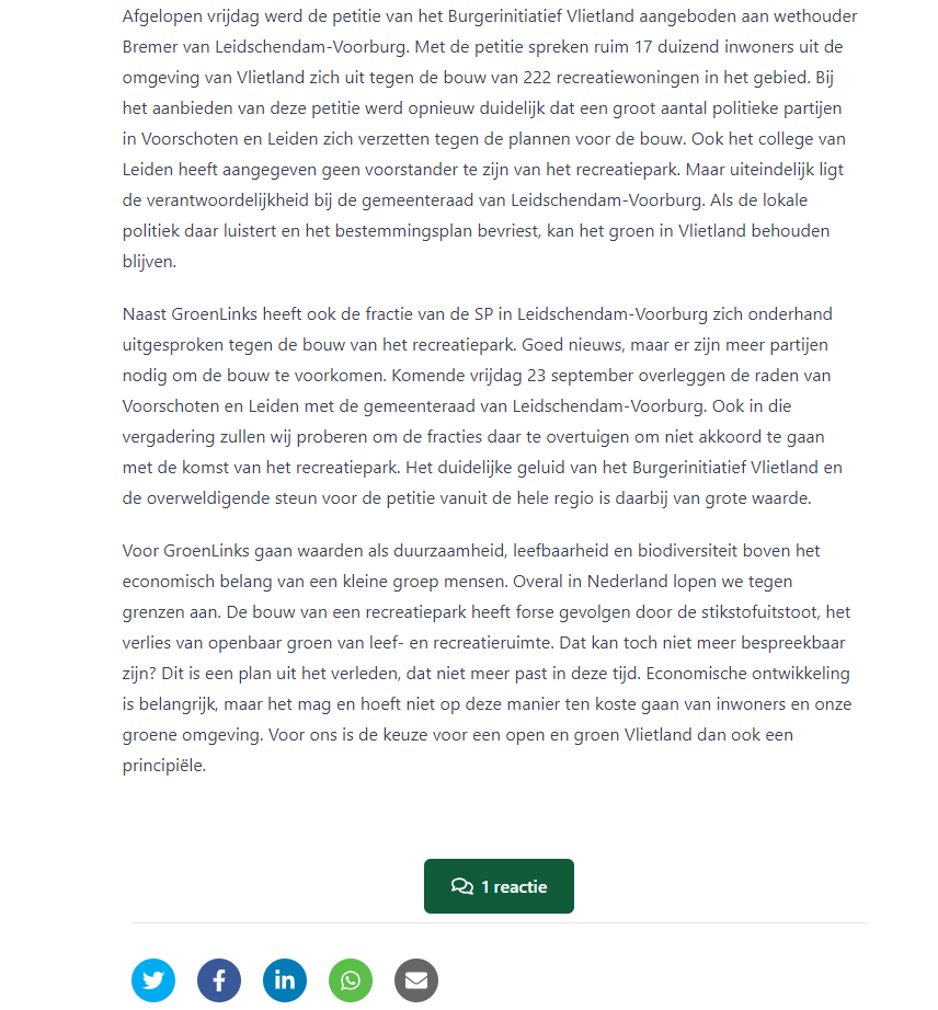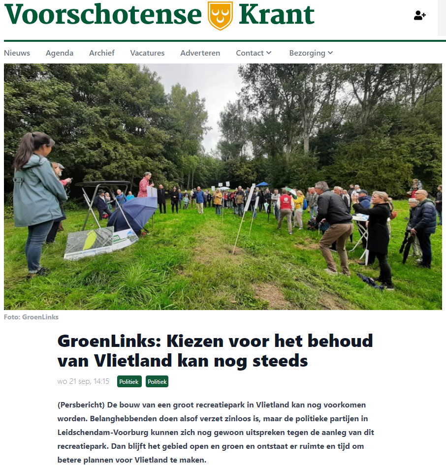 De bouw van een groot recreatiepark in Vlietland kan nog voorkomen worden. Belanghebbenden doen alsof verzet zinloos is, maar de politieke partijen in Leidschendam-Voorburg kunnen zich nog gewoon uitspreken tegen de aanleg van dit recreatiepark. Dan blijft het gebied open en groen en ontstaat er ruimte en tijd om betere plannen voor Vlietland te maken.