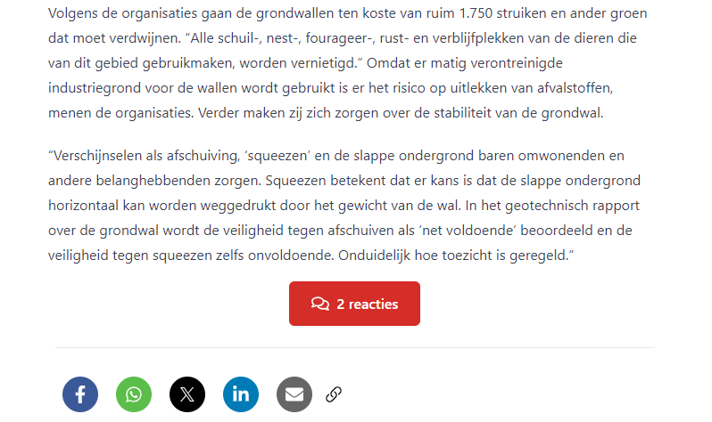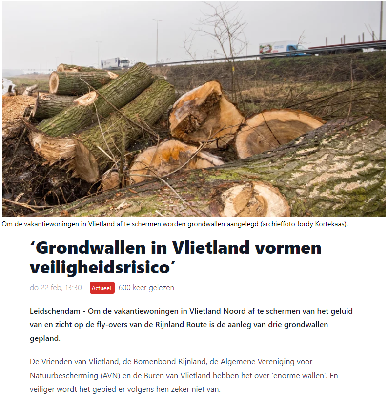 De Vrienden van Vlietland, de Bomenbond Rijnland, de Algemene Vereniging voor Natuurbescherming (AVN) en de Buren van Vlietland hebben het over ‘enorme wallen’. En veiliger wordt het gebied er volgens hen zeker niet van.