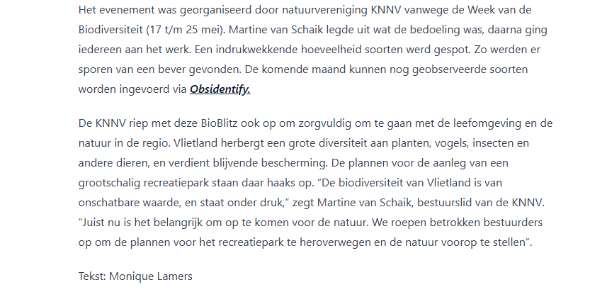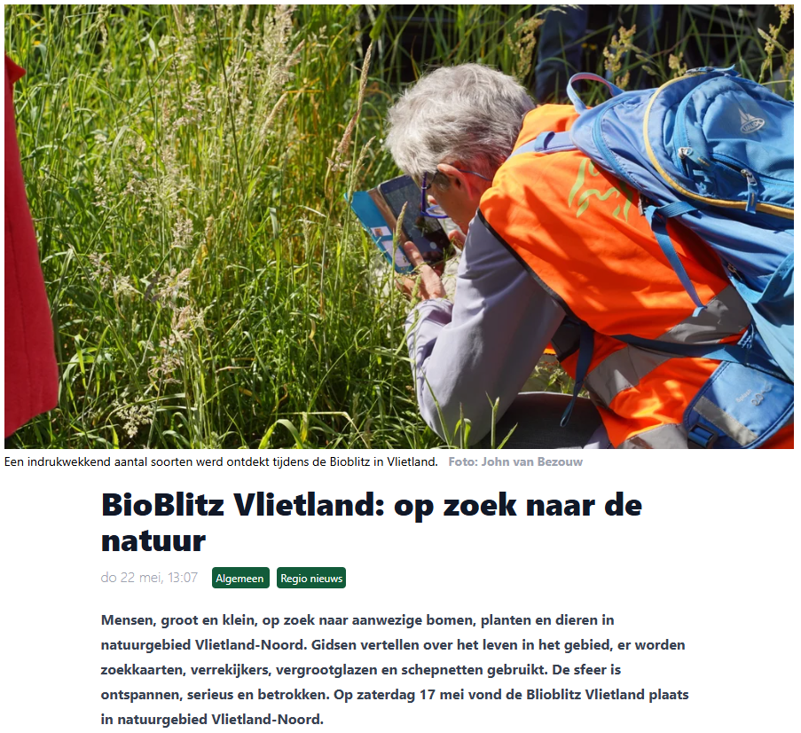 Dat is de inleiding van het artikel dat over de Bioblitz, waarvoor de Vrienden ook hun leden opgeroepen hebben, verscheen in de Voorschotense Krant. Met daarbij de foto’s John van Bezouw.