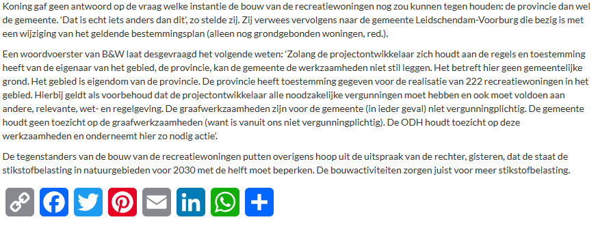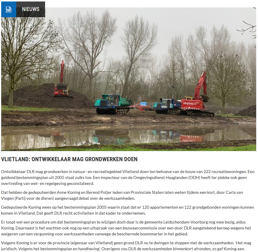 Ontwikkelaar DLR mag grondwerken in natuur- en recreatiegebied Vlietland doen ten behoeve van de bouw van 222 recreatiewoningen. Een geldend bestemmingsplan uit 2005 staat zulks toe. Een inspecteur van de Omgevingsdienst Haaglanden (ODH) heeft ter plekke ook geen overtreding van wet- en regelgeving geconstateerd. Dat hebben de gedeputeerden Anne Koning en Berend Potjer leden van Provinciale Staten laten weten tijdens een kort, door Carla van Viegen (Partij voor de dieren) aangevraagd debat over de werkzaamheden.