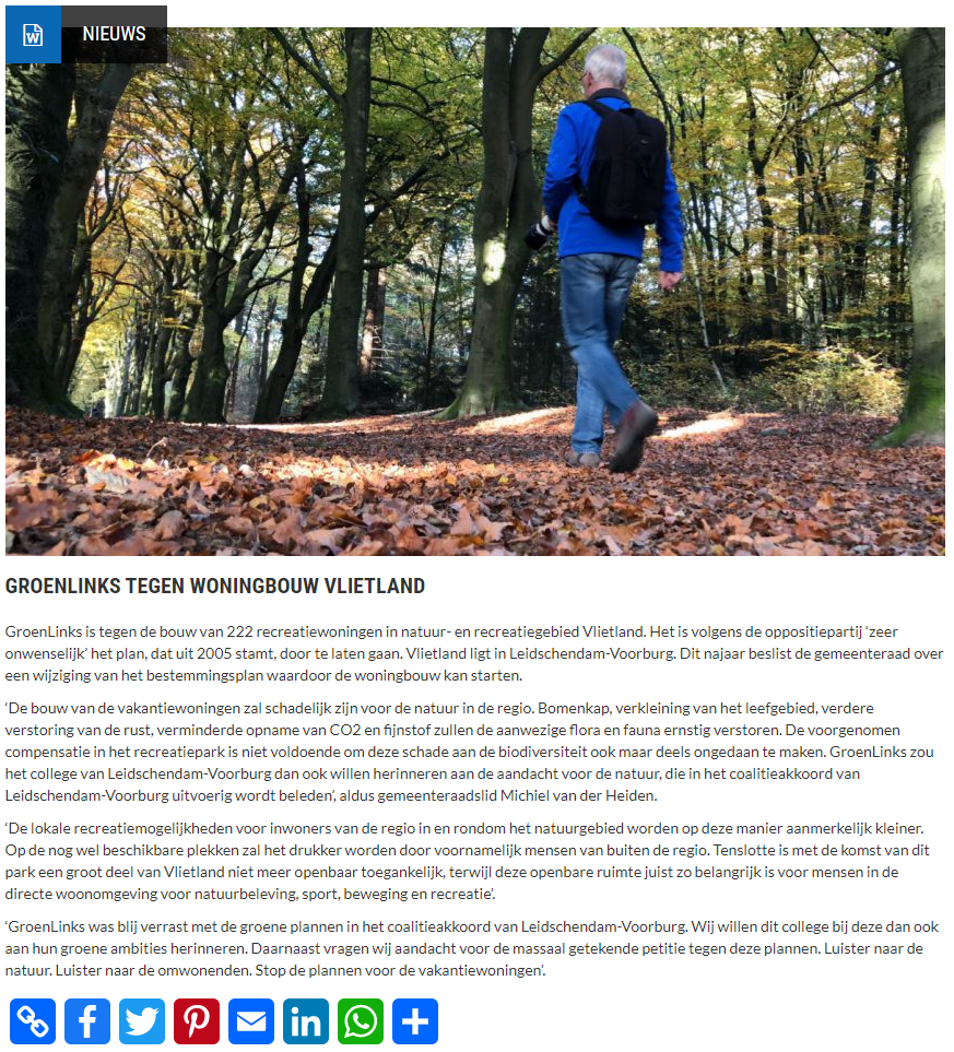 GroenLinks van Leidschendam-Voorburg is tegen de bouw van 222 recreatiewoningen in natuur- en recreatiegebied Vlietland. Het is volgens de oppositiepartij ‘zeer onwenselijk’ het plan, dat uit 2005 stamt, door te laten gaan. Vlietland ligt in Leidschendam-Voorburg. Dit najaar beslist de gemeenteraad over een wijziging van het bestemmingsplan waardoor de woningbouw kan starten.