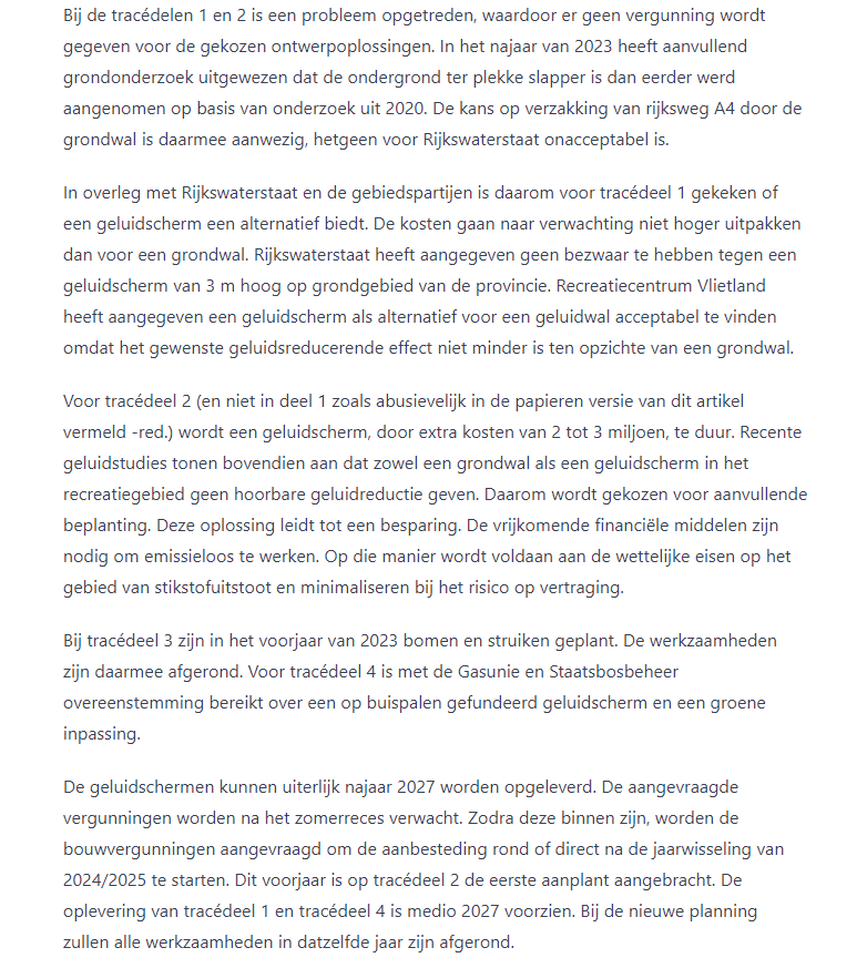 De provincie Zuid-Holland gaat een aantal geluid- en zichtwerende maatregelen nemen in Vlietland om de recreatieve beleving van Vlietland en de Vogelplas Starrevaart te verbeteren als het verkeer op de A4 minder hoorbaar en zichtbaar is.