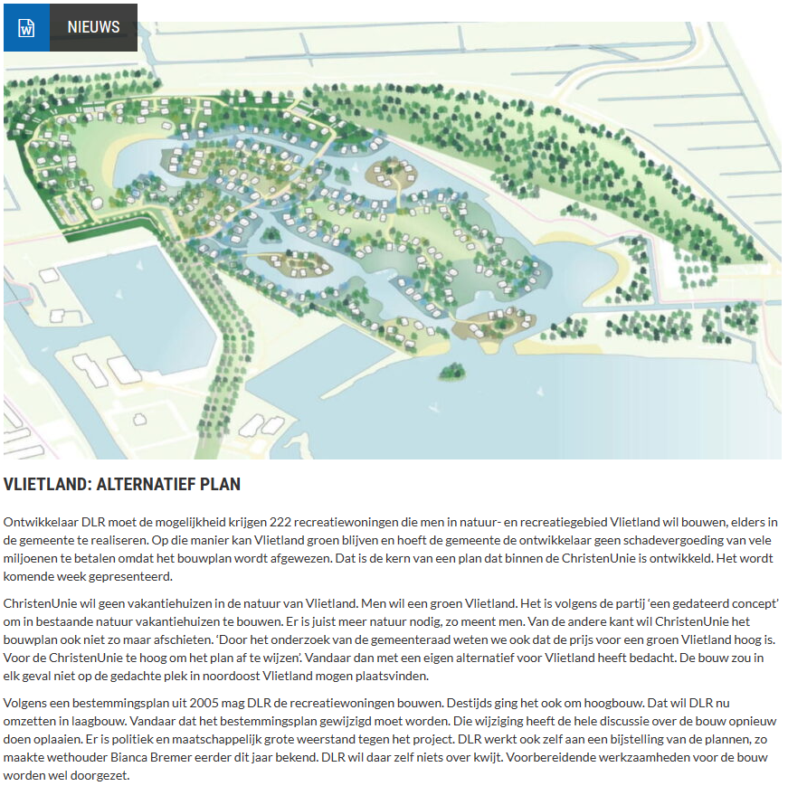Ontwikkelaar DLR moet de mogelijkheid krijgen 222 recreatiewoningen die men in natuur- en recreatiegebied Vlietland wil bouwen, elders in de gemeente te realiseren. Op die manier kan Vlietland groen blijven en hoeft de gemeente de ontwikkelaar geen schadevergoeding van vele miljoenen te betalen omdat het bouwplan wordt afgewezen. Dat is de kern van een plan dat binnen de ChristenUnie is ontwikkeld. Het wordt komende week gepresenteerd en de Vrienden zijn er zeer benieuwd naar!