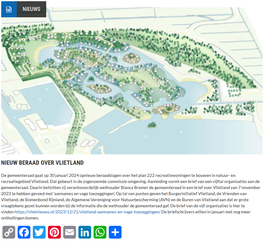 De gemeenteraad gaat op 30 januari 2024 opnieuw beraadslagen over het plan 222 recreatiewoningen te bouwen in natuur- en recreatiegebied Vlietland. Dat gebeurt in de zogenoemde commissie omgeving. Aanleiding vormt een brief van een vijftal organisaties aan de gemeenteraad. Daarin betichten zij verantwoordelijk wethouder Bianca Bremer de gemeenteraad in een brief over Vlietland van 7 november 2023 te hebben gevoed met ‘aannames en vage toezeggingen’.
