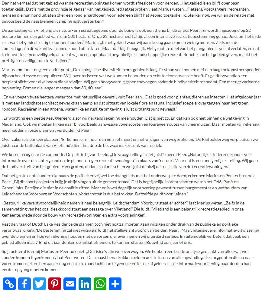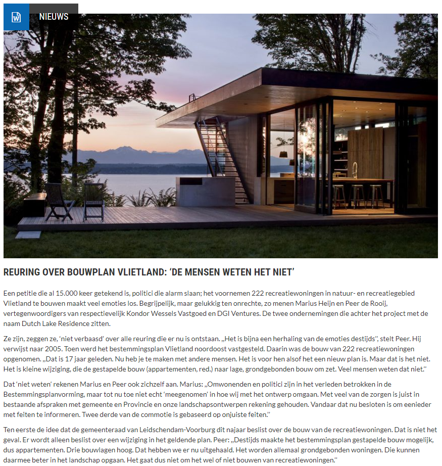 Een petitie die al 15.000 keer getekend is, politici die alarm slaan; het voornemen 222 recreatiewoningen in natuur- en recreatiegebied Vlietland te bouwen maakt veel emoties los. Begrijpelijk, maar gelukkig ten onrechte, zo menen Marius Heijn en Peer de Rooij, vertegenwoordigers van respectievelijk Kondor Wessels Vastgoed en DGI Ventures. De twee ondernemingen die achter het project met de naam Dutch Lake Residence zitten.