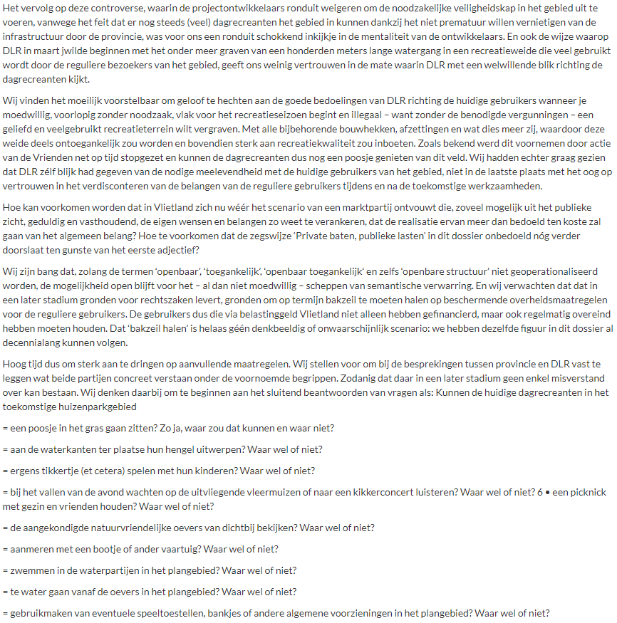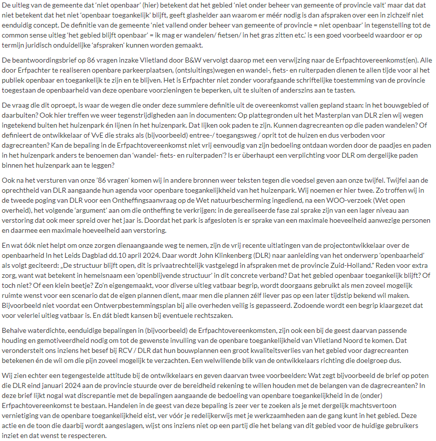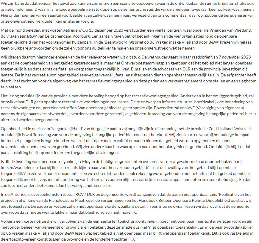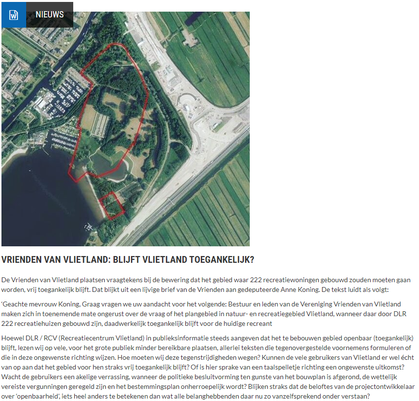 De Vereniging Vrienden van Vlietland maken zich in toenemende mate ongerust over de vraag of het plangebied in natuur- en recreatiegebied Vlietland, wanneer daar door DLR (VolkerWessels) 222 recreatiehuizen gebouwd zijn, daadwerkelijk toegankelijk blijft voor de huidige recreanten.