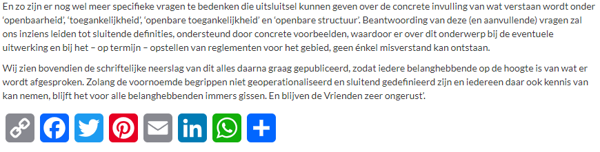 Daarom hebben de Vrienden deze brief aan gedeputeerde Anne Koning van de Provincie Zuid-Holland (PZH) gestuurd. Daarin roepen we de provincie op vast te leggen wat PZH en DLR concreet verstaan onder termen ‘openbaar’, ‘toegankelijk’, ‘openbaar toegankelijk‘ en zelfs ‘openbare structuur’. De Vrienden zijn bang dat als deze termen niet geoperationaliseerd worden, de mogelijkheid open blijft voor het -al dan niet moedwillig – scheppen van semantische verwarring.