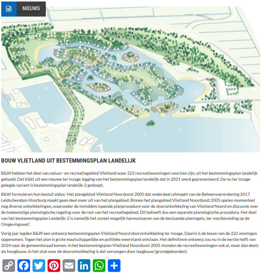 B&W hebben het deel van natuur- en recreatiegebied Vlietland waar 222 recreatiewoningen voorzien zijn, uit het bestemmingsplan landelijk gehaald. Dat blijkt uit een nieuwe ter inzage legging van het bestemmingsplan landelijk dat in 2021 werd gepresenteerd. De nu ter inzage gelegde variant is bestemmingsplan landelijk-2 gedoopt.