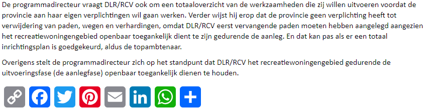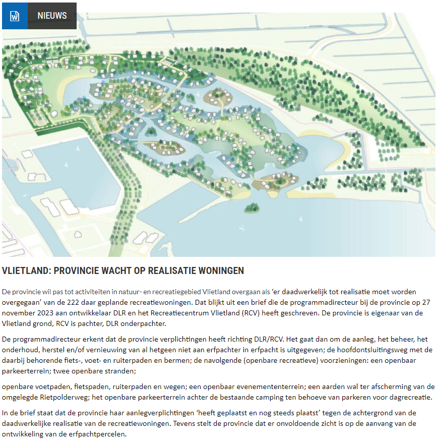 De provincie wil pas tot activiteiten in natuur- en recreatiegebied Vlietland overgaan als ‘er daadwerkelijk tot realisatie moet worden overgegaan’ van de 222 daar geplande recreatiewoningen. Dat blijkt uit een brief die de programmadirecteur bij de provincie op 27 november 2023 aan ontwikkelaar DLR en het Recreatiecentrum Vlietland (RCV) heeft geschreven. De provincie is eigenaar van de Vlietland grond, RCV is pachter, DLR onderpachter. Opzienbarend aangezien ontwikkelaar DLR de provincie Zuid-Holland twee dagen geleden in gebreke heeft gesteld.