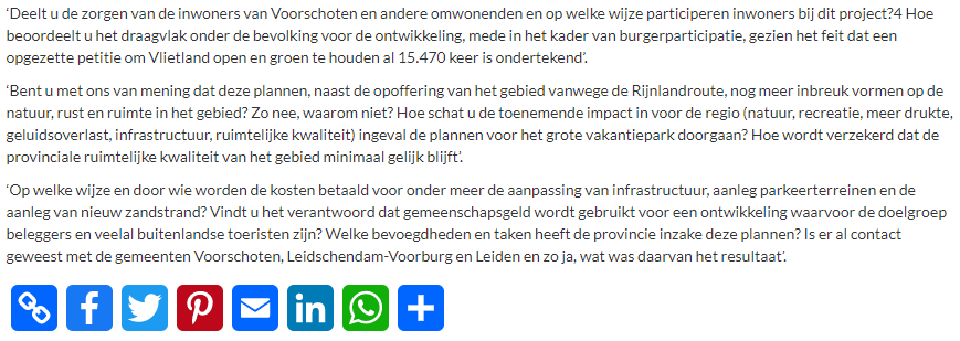 Carla van Viegen, fractievoorzitter Partij voor de Dieren in Provinciale Staten Zuid-Holland, wil van Gedeputeerde Staten weten wat zij vinden over de bouwplannen voor natuur- en recreatiegebied Vlietland, waar de provincie eigenaar van is. Ook vraagt zij welke mogelijkheden er voor de provincie zijn om de bouw tegen te houden.