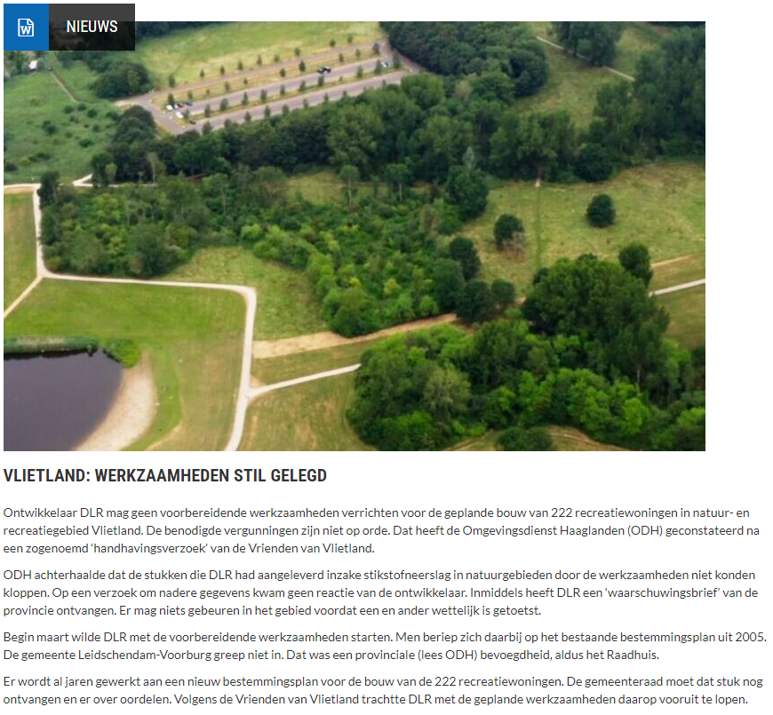 Na een zogenoemd ‘handhavingsverzoek’ van de Vrienden van Vlietland heeft de Omgevingsdienst Haaglanden (ODH) geconstateerd dat de benodigde vergunningen niet op orde zijn. Ontwikkelaar DLR mag daarom geen voorbereidende werkzaamheden verrichten voor de geplande bouw van 222 recreatiewoningen in natuur- en recreatiegebied Vlietland.