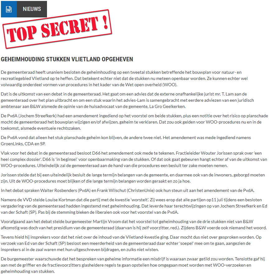 De gemeenteraad heeft unaniem besloten de geheimhouding op een tweetal stukken betreffende het bouwplan voor natuur- en recreatiegebied Vlietland op te heffen. Dat betekent echter niet dat de stukken nu meteen openbaar worden. Ze kunnen echter wel volwaardig onderdeel vormen van procedures in het kader van de Wet open overheid (WOO).