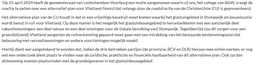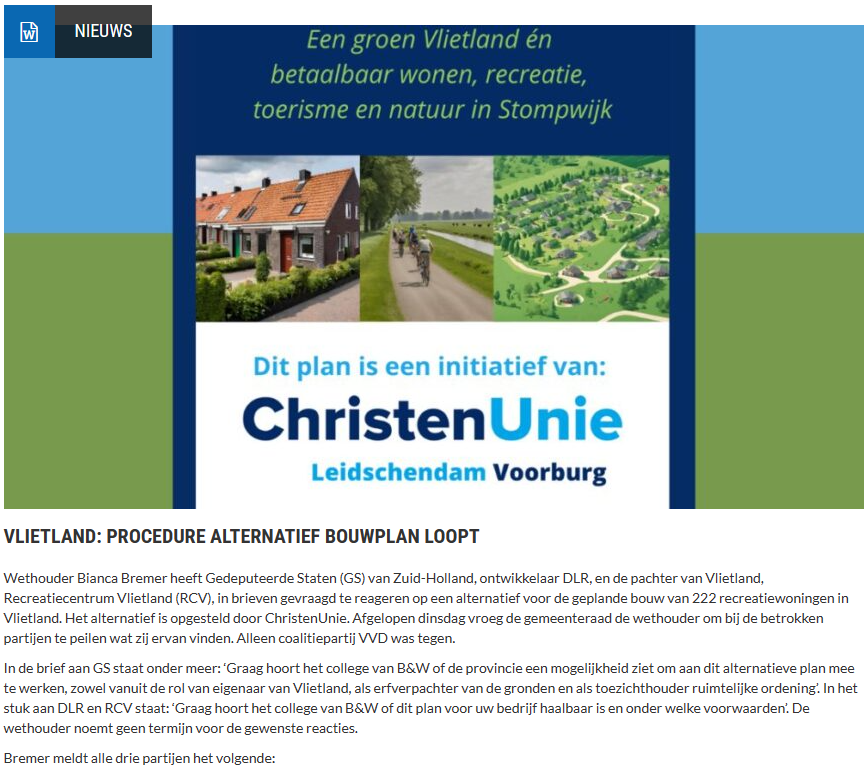 Wethouder Bianca Bremer heeft Gedeputeerde Staten (GS) van Zuid-Holland, ontwikkelaar DLR, en de pachter van Vlietland, Recreatiecentrum Vlietland (RCV), in brieven gevraagd te reageren op een alternatief voor de geplande bouw van 222 recreatiewoningen in Vlietland. Het alternatief is opgesteld door ChristenUnie. Afgelopen dinsdag vroeg de gemeenteraad de wethouder om bij de betrokken partijen te peilen wat zij ervan vinden. Alleen coalitiepartij VVD was tegen.