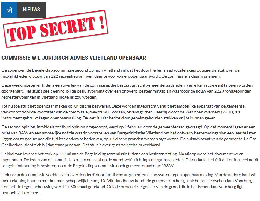 De zogenoemde Begeleidingscommissie second opinion Vlietland wil dat het door Helleman advocaten geproduceerde stuk over de mogelijkheden d bouw van 222 recreatiewoningen daar te voorkomen, openbaar wordt. De commissie is daarin unaniem.