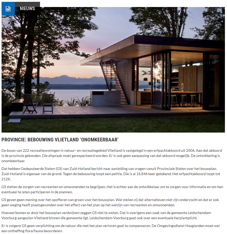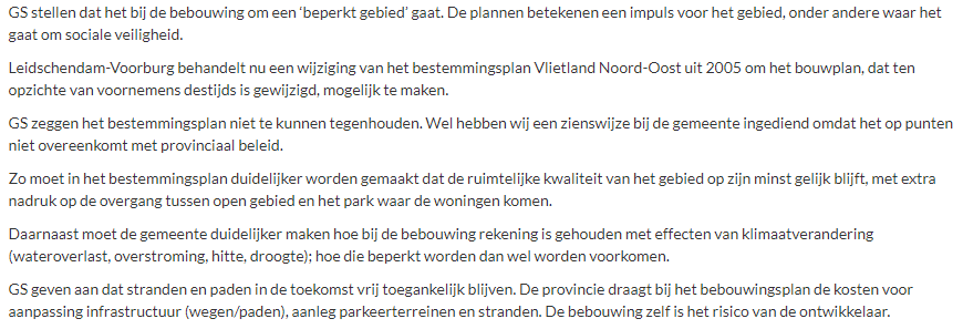 Tevens is bij deze beantwoording de zienswijze gevoegd die PZH n.a.v. het ontwerpbestemmingsplan “Doorontwikkeling Vlietland Noord” heeft ingediend bij de Gemeente Leidschendam-Voorburg.
