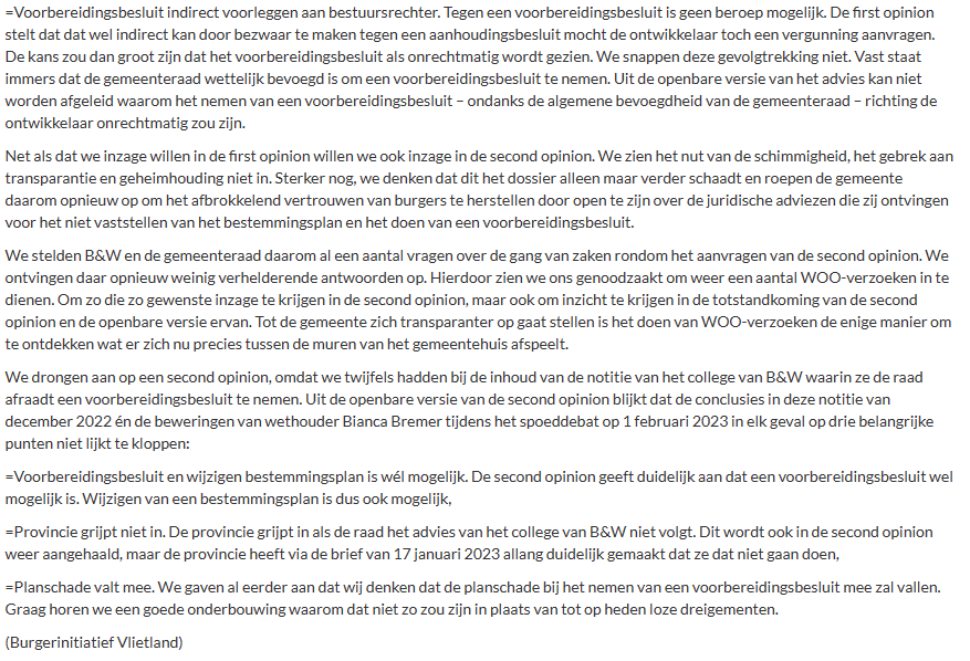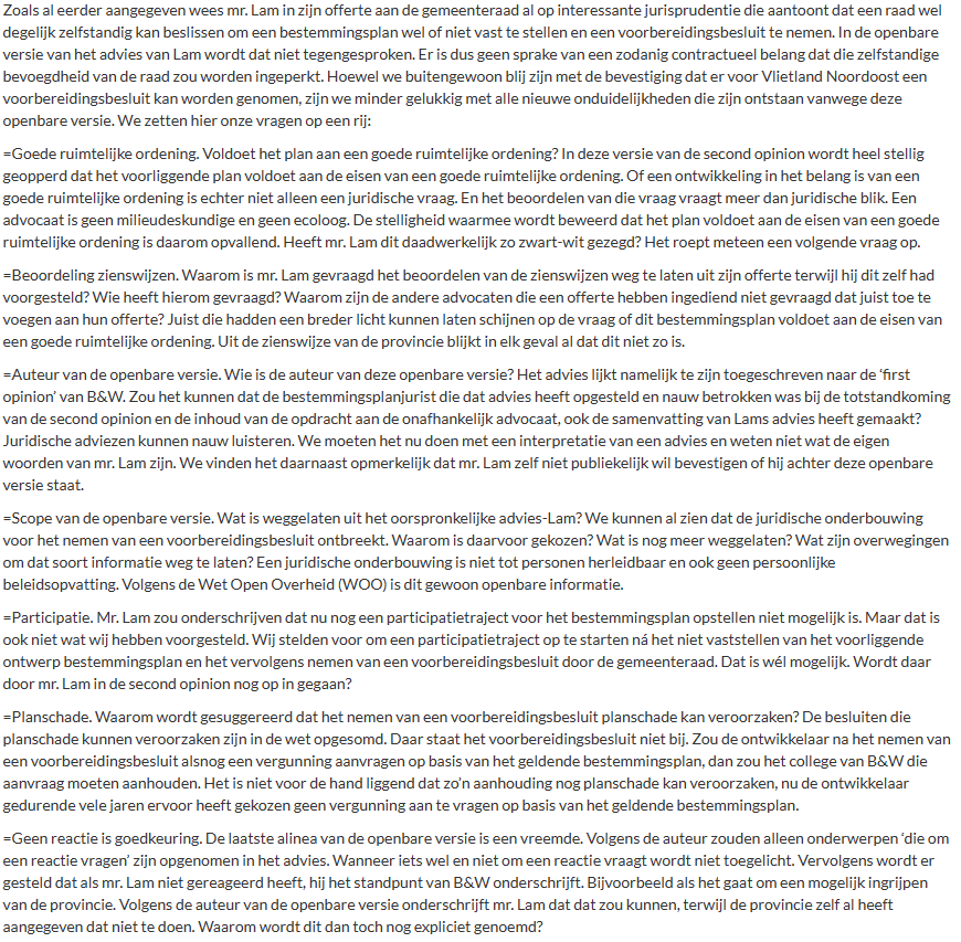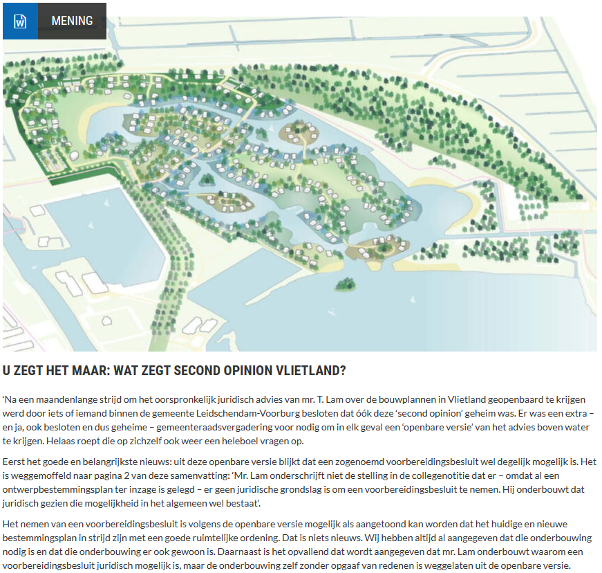 ‘Na een maandenlange strijd om het oorspronkelijk juridisch advies van mr. T. Lam over de bouwplannen in Vlietland geopenbaard te krijgen werd door iets of iemand binnen de gemeente Leidschendam-Voorburg besloten dat óók deze ‘second opinion’ geheim was. Er was een extra – en ja, ook besloten en dus geheime – gemeenteraadsvergadering voor nodig om in elk geval een ‘openbare versie’ van het advies boven water te krijgen. Helaas roept die op zichzelf ook weer een heleboel vragen op.