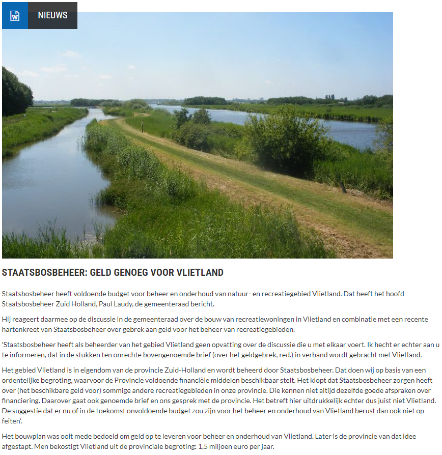 Staatsbosbeheer heeft voldoende budget voor beheer en onderhoud van natuur- en recreatiegebied Vlietland. Dat heeft het hoofd Staatsbosbeheer Zuid Holland, Paul Laudy, de gemeenteraad bericht n.a.v. misleidende opinies zoals door DLR en RCV zijn verspreid.