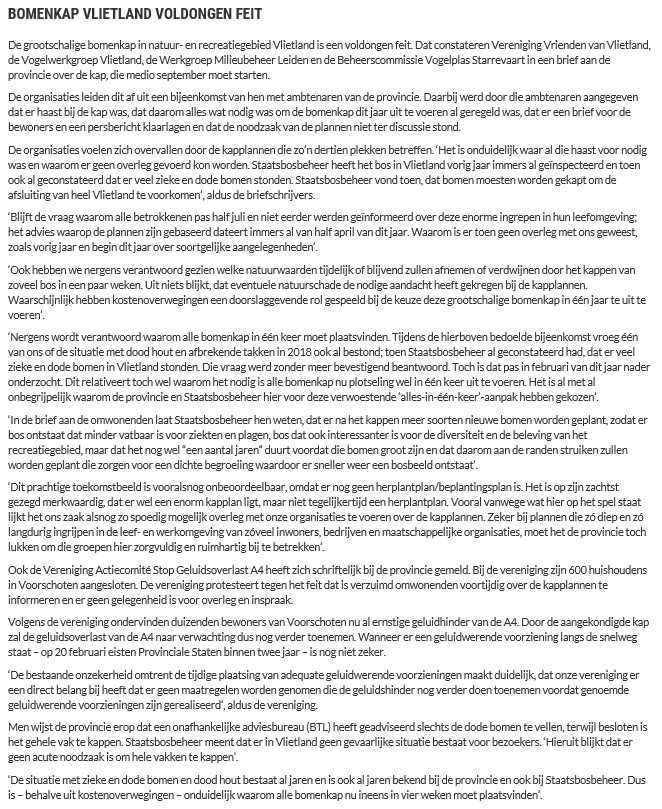 Nieuwsbericht 1 augustus 2019 op Vlietnieuws over Bomenkap Vlietland voldongen feit