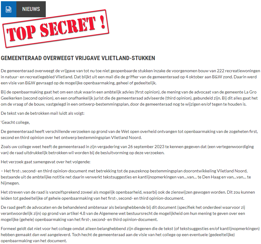 Nieuwsbericht 31 oktober 2023 op Vlietnieuws over Gemeenteraad overweegt vrijgave Vlietland-stukken