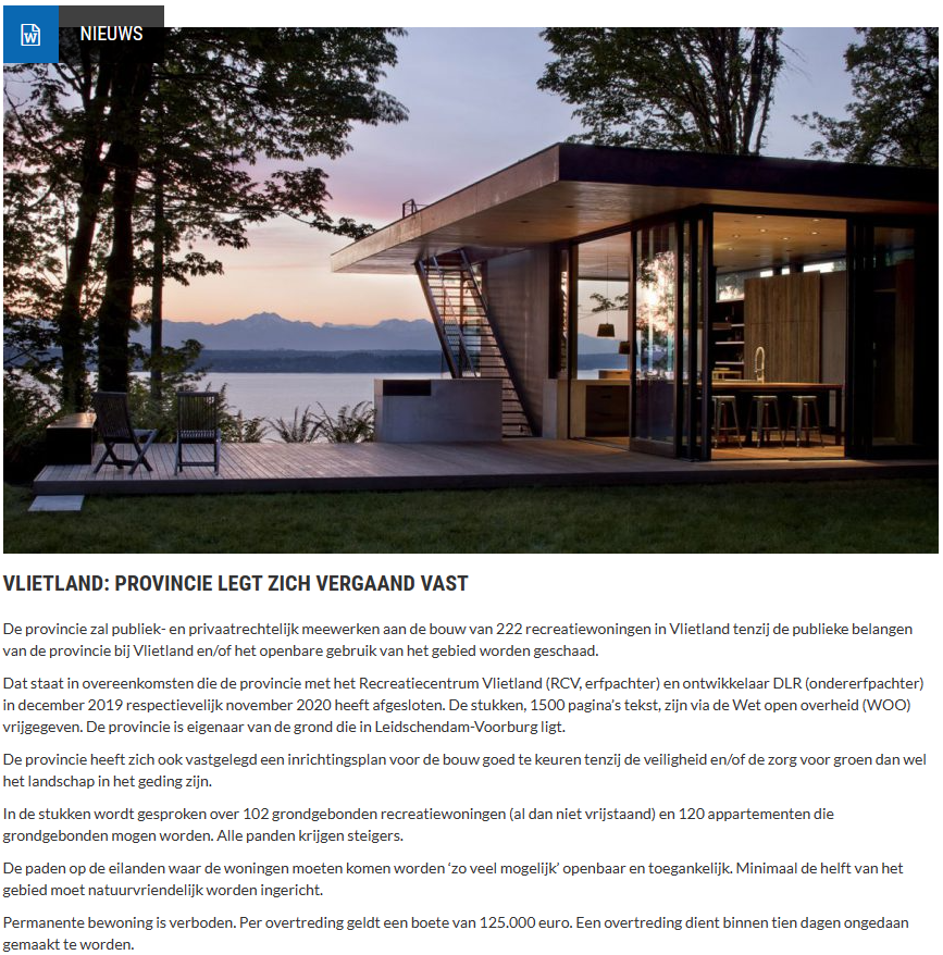 De provincie zal publiek- en privaatrechtelijk meewerken aan de bouw van 222 recreatiewoningen in Vlietland tenzij de publieke belangen van de provincie bij Vlietland en/of het openbare gebruik van het gebied worden geschaad.