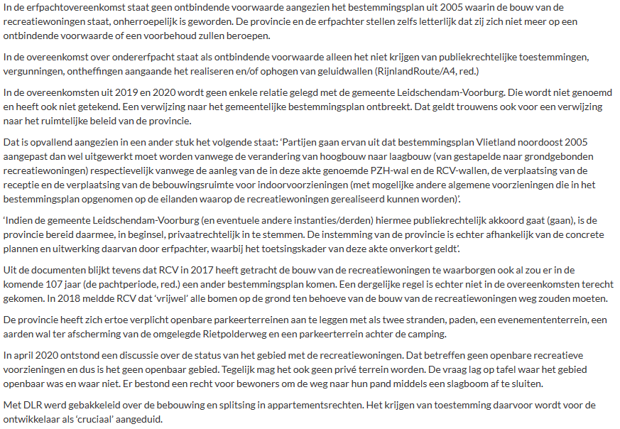 Dat staat in overeenkomsten die de provincie met het Recreatiecentrum Vlietland (RCV, erfpachter) en ontwikkelaar DLR (ondererfpachter) in december 2019 respectievelijk november 2020 heeft afgesloten. De stukken, 1500 pagina’s tekst, zijn via de Wet open overheid (WOO) vrijgegeven. De provincie is eigenaar van de grond die in Leidschendam-Voorburg ligt.