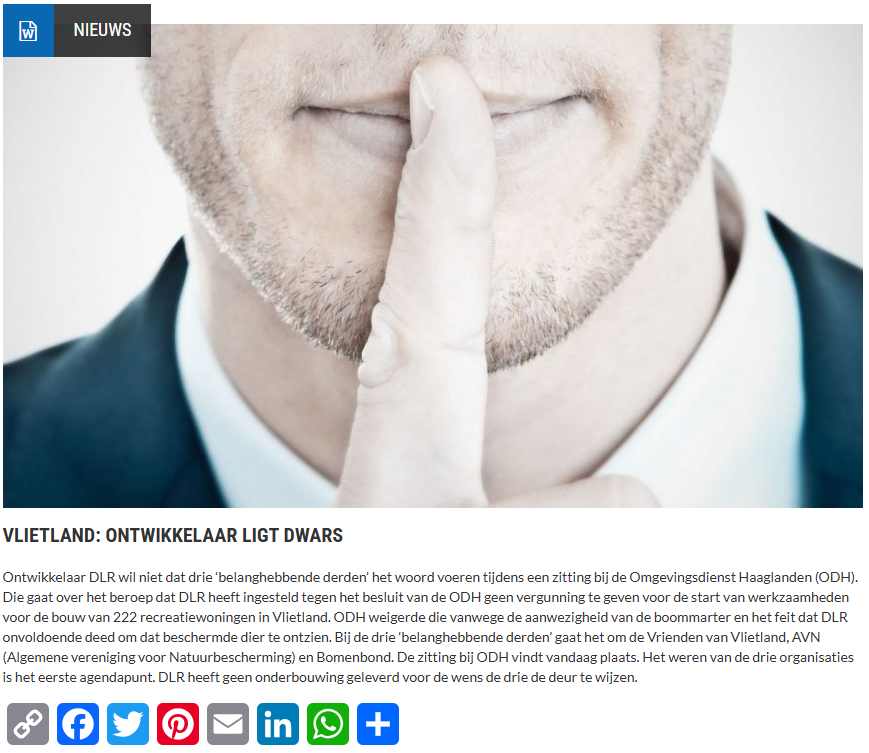 Ontwikkelaar DLR wil niet dat drie ‘belanghebbende derden’ het woord voeren tijdens een zitting bij de Omgevingsdienst Haaglanden (ODH). Die gaat over het beroep dat DLR heeft ingesteld tegen het besluit van de ODH geen vergunning te geven voor de start van werkzaamheden voor de bouw van 222 recreatiewoningen in Vlietland. ODH weigerde die vanwege de aanwezigheid van de boommarter en het feit dat DLR onvoldoende deed om dat beschermde dier te ontzien. Bij de drie ‘belanghebbende derden’ gaat het ondermeer om de Vrienden van Vlietland.