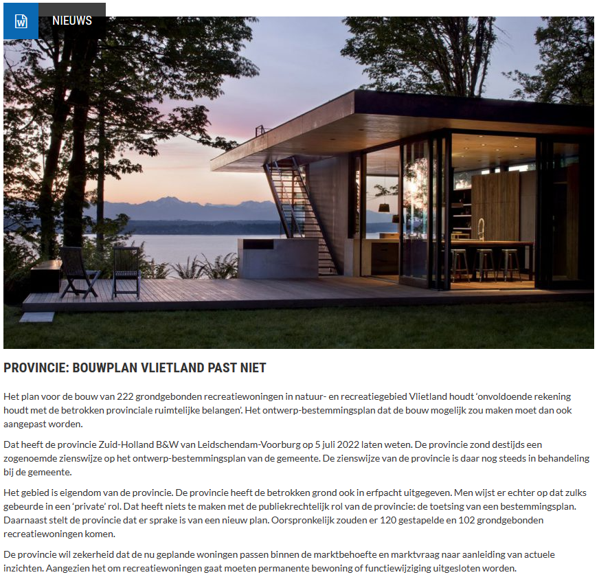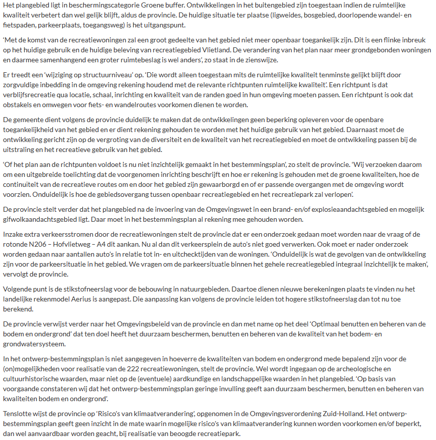 Het plan voor de bouw van 222 grondgebonden recreatiewoningen in natuur- en recreatiegebied Vlietland houdt ‘onvoldoende rekening houdt met de betrokken provinciale ruimtelijke belangen’. Het ontwerp-bestemmingsplan dat de bouw mogelijk zou maken moet dan ook aangepast worden.