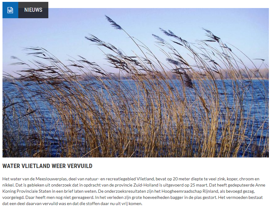 Eerder was al bekend geworden dat metingen van 25 maart duidelijk hadden gemaakt weer te veel zink, koper, chroom en nikkel in de Meeslouwerplas van Vlietland is aangetroffen. Nu heeft gedeputeerde Anne Koning dat ook Provinciale Staten laten weten en deze resultaten aan het Hoogheemraadschap Rijnland, als bevoegd gezag, voorgelegd.