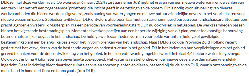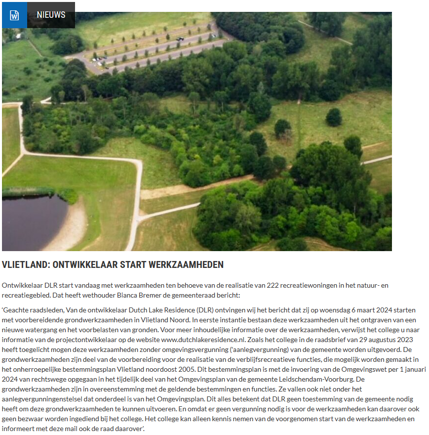 Ontwikkelaar DLR start vandaag met werkzaamheden ten behoeve van de realisatie van 222 recreatiewoningen in het natuur- en recreatiegebied. Dat heeft wethouder Bianca Bremer de gemeenteraad bericht volgens onderstaand bericht op Vlietnieuws.